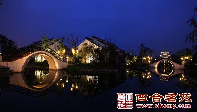 徽派建筑與北方建筑大不相同,粉墻黛外院內(nèi)曲徑通幽,具有南方園林的某種特色,沒有過多的彩繪描金,但是不失高貴典雅。小橋流水,荷塘月色別具一番風(fēng)趣。 ![]() 院門口夜景 ![]() 拱橋夜景 ![]() 大門入口 |